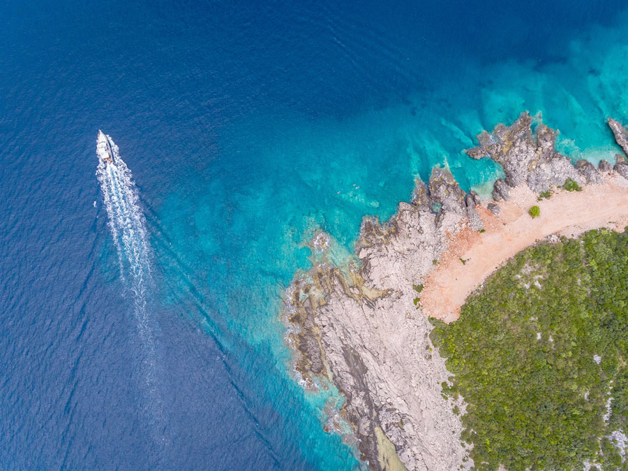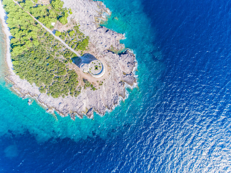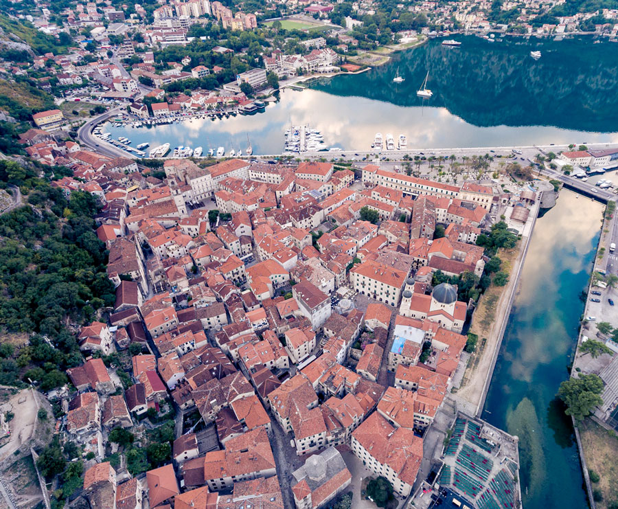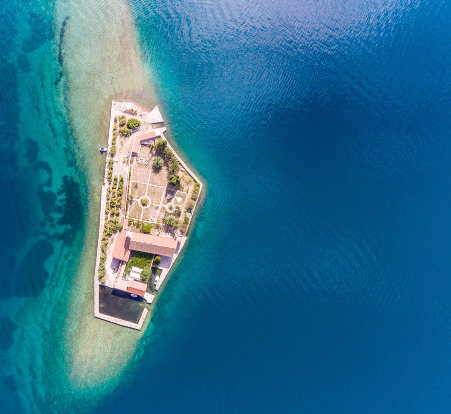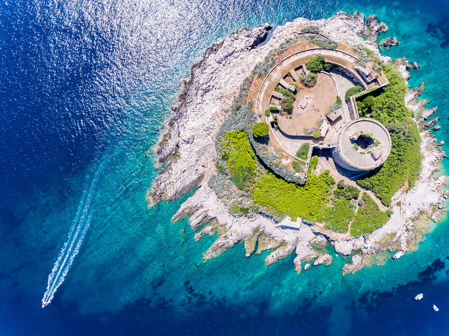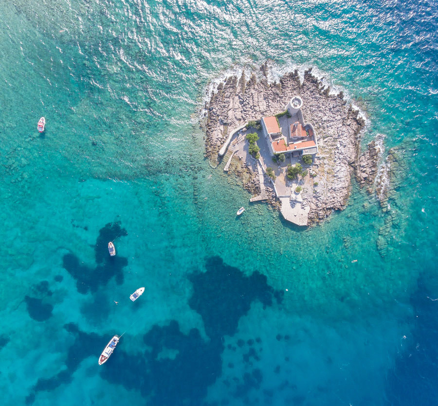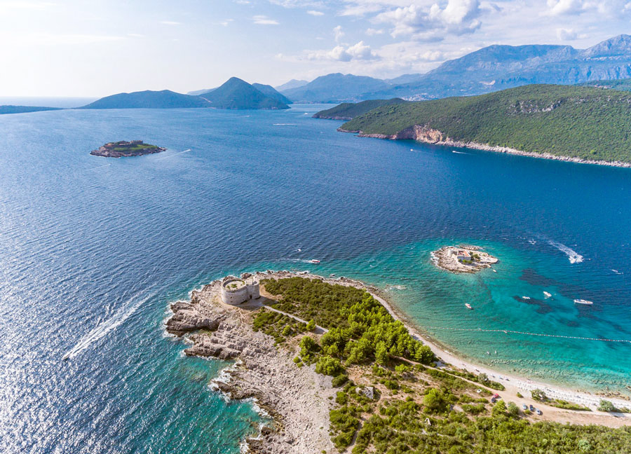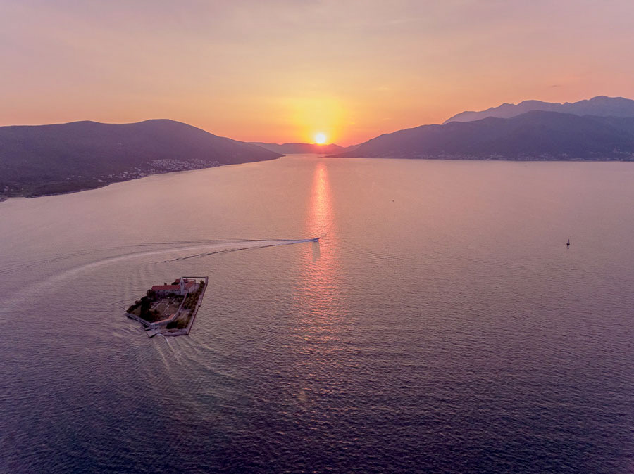 View of Boka Kotorska with Fort Arza, Mamula island (in the back) and Monastery of Zanjice